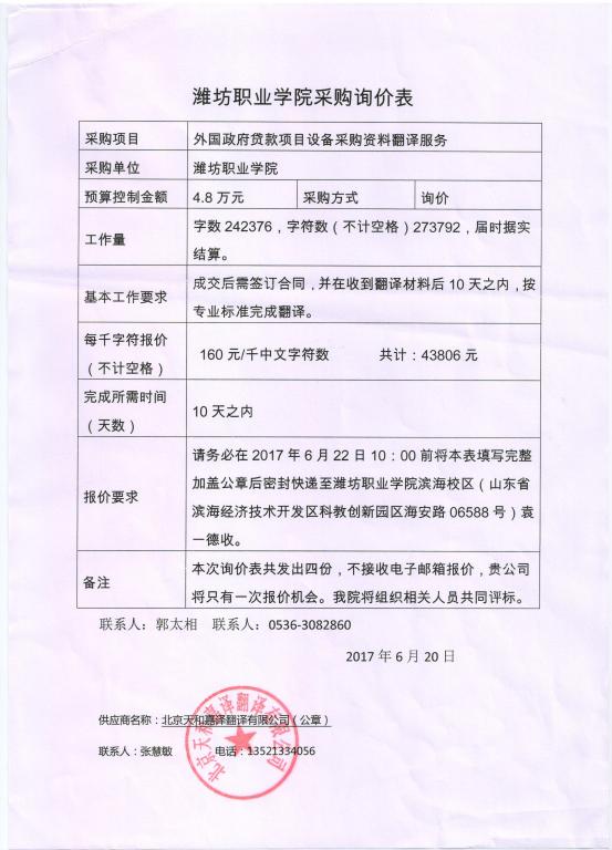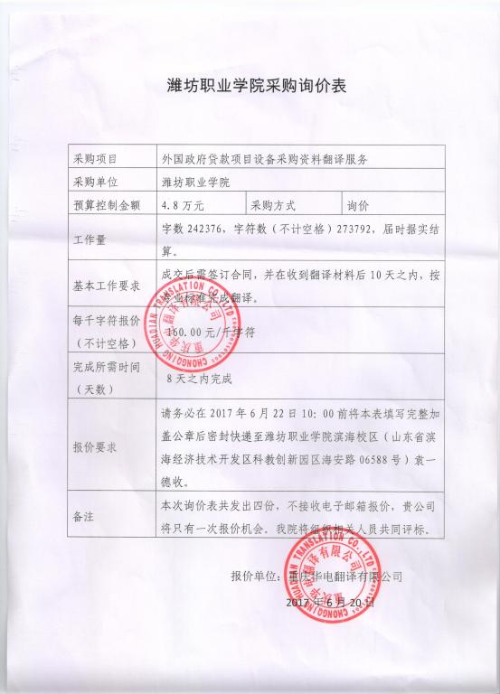 2017年6月20日,我单位以电子邮件方式向北京天和嘉译翻译有限公司、重庆华电翻译有限公司、北京天和汇佳翻译有限公司和重庆柯美翻译有限公司发出询价函,请四家公司于6月22日10时前以书面形式报价并密封特快传递至天行体育官方网站招投标管理办公室。6月23日上午10:00前收齐四家公司的报价快递。6月23日下午在院纪委同志监督下,开启报价函。根据报价情况,现确定北京天和嘉译翻译有限公司和重庆华电翻译有限公司为入围单位。