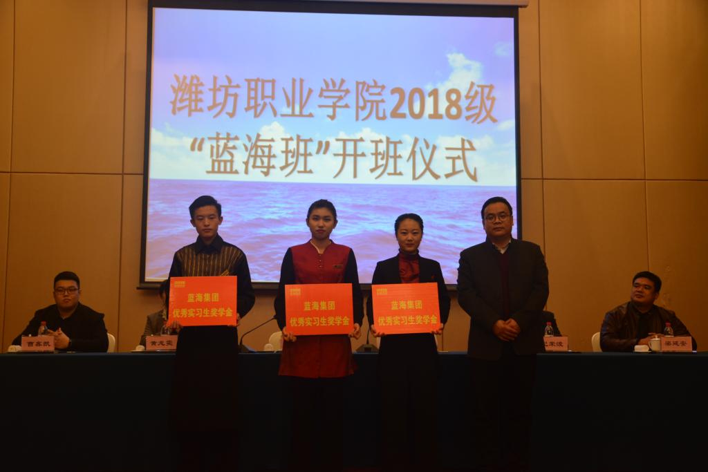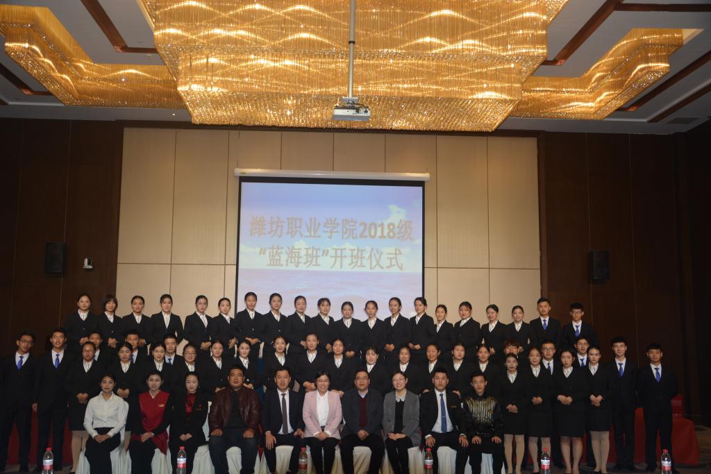 11月15日下午2点半,国际商务天行体育官方网站与山东蓝海酒店集团合作共建的2018级企业订单班“蓝海精英班”开班仪式在潍坊蓝海大饭店举行。山东蓝海酒店集团人力资源部副总监杨兆永、潍坊蓝海大饭店总经理纪荣波、国际商务天行体育官方网站学生工作和产学工作负责同志及2018级“蓝海精英班”全体同学参加本次开班仪式。