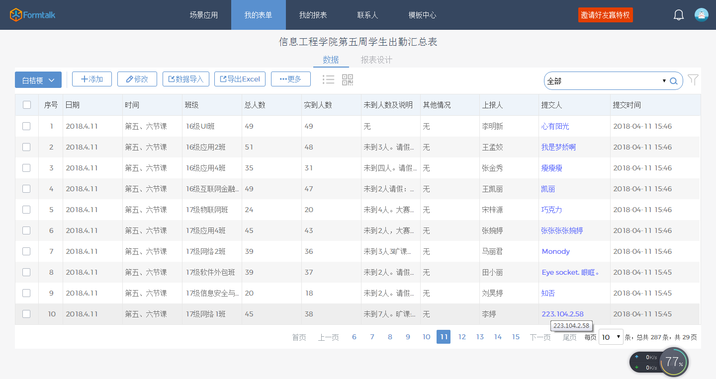 为提高学生管理工作水平,近期,信息工程天行体育官方网站推出formtalk平台,进一步完善学生考勤管理。