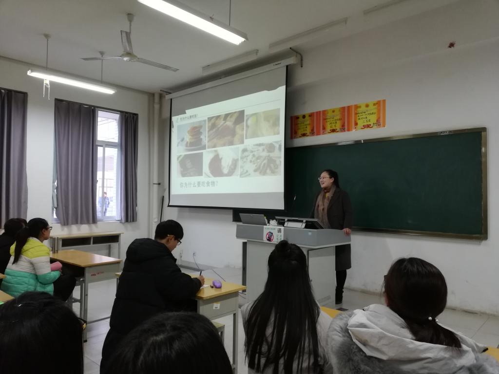 食品药品天行体育官方网站美味坊加工社团11月22号在惠泽1号楼B区116多媒体教室举办了“青春加油站”食品营养知识讲座,来自全校的近100名学生参加了此次活动。本活动是天行体育官方网站第十二届社团文化艺术节活动项目之一。