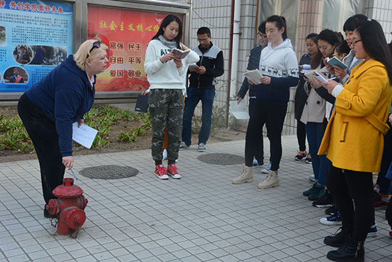 外籍教师Brenda带领学生走遍整个校园,将视野范围之内的物品对学生一一讲解。大家时而跟随她大喊“Parking space”,时而苦苦思索“井盖”应该用哪个英语单词表达更为贴切。平时我们天天所见所感的物品都成为Brenda的教学素材:停车场、旗杆、保卫处、消防栓、垃圾桶、限速杆……学生们一边学,一边记,一边跟读。动态课堂,无拘无束,整个校园成为一个大课堂。整堂课下来,学生们在轻松愉快的氛围中学习英语,还时不时地被外教诙谐幽默的语言和肢体动作逗乐,爆发出阵阵开心的笑声。