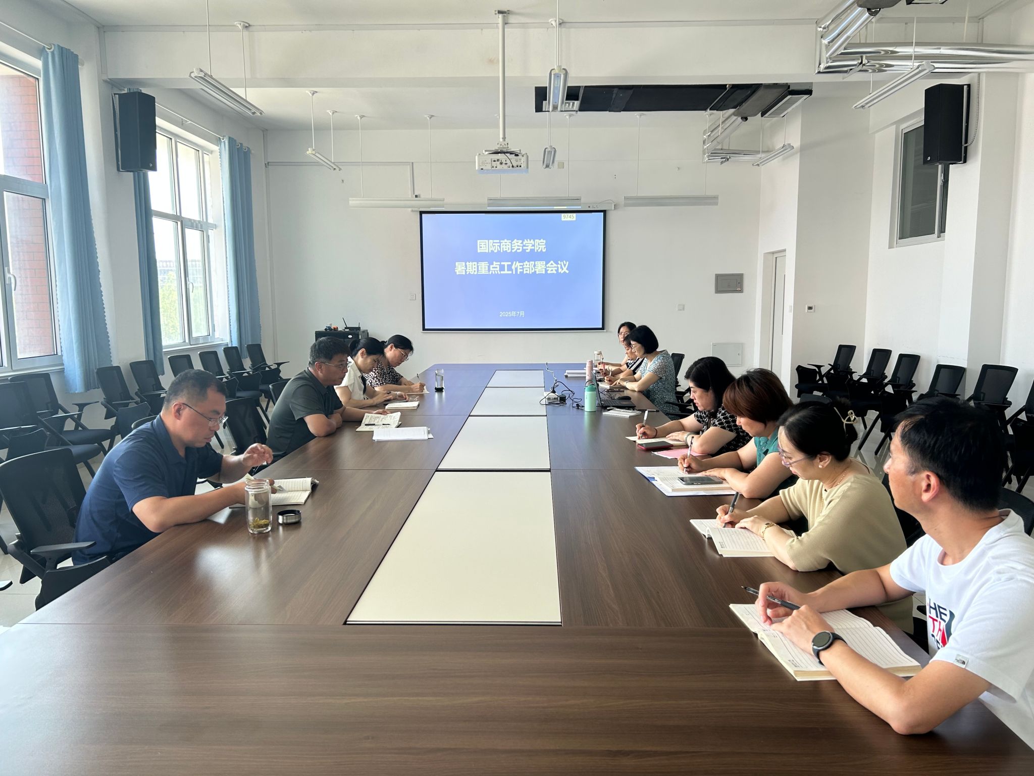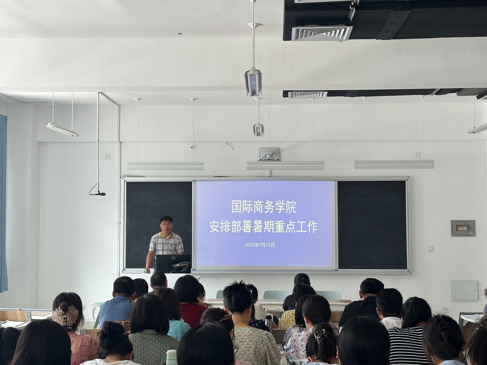 为深入贯彻落实天行体育官方网站第二次党代会精神,国际商务天行体育官方网站于7月8日和10日分别召开副科级及以上人员会议和全体教师会议,全面部署暑期重点工作。