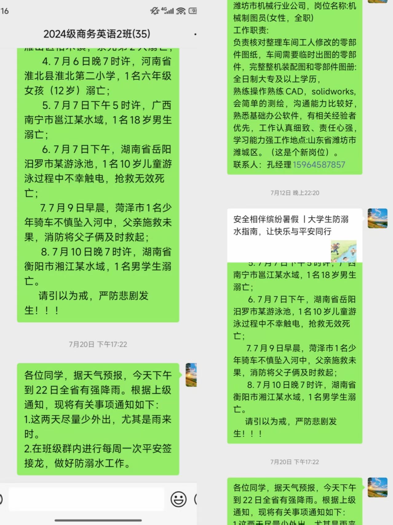 针对学生地域分布广、暑期实习实践多的特点,我院充分利用数字化手段,通过“每周安全播报”定点发送班级微信群等形式,实现安全教育的广覆盖和精准触达。通过假期“云家访”的方式,与学生及家长共同做好防溺水工作,重申“六不”准则和家长监护责任,并定期在家长群推送暑期防溺水安全指南。坚持做到严格执行值班制度,辅导员每周联系学生,动态跟踪“不掉线”,通过线上方式与学生保持联系,了解动态,传递关心。