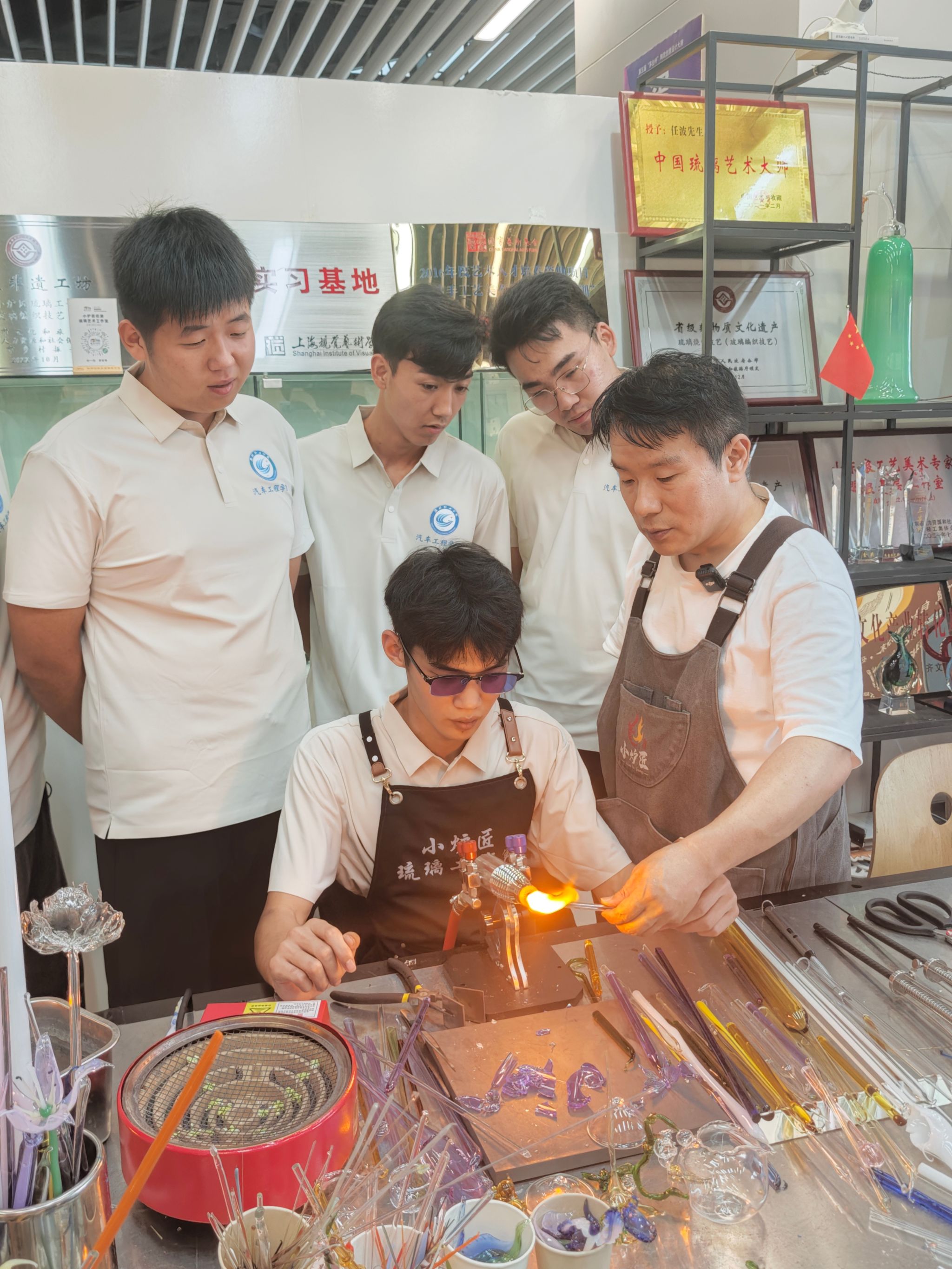 探寻琉璃秘境,传承千年匠心。在琉璃文化探寻之旅中,团队首站来到淄博陶瓷琉璃博物馆,馆内流光溢彩的琉璃展品让同学们惊叹不已,从古代宫廷贡品到现代艺术珍品,一件件作品展现着琉璃工艺的千年传承。随后,团队专访了非物质文化遗产传承人、淄博工匠任波,他向同学们讲述了琉璃制作的复杂工序,从原料配比到火候控制,每一步都凝聚着匠人的心血。“琉璃是火与土的艺术,更是耐心与坚守的结晶。” 他的话语让同学们深受触动。在动手实践环节,同学们在任波的指导下尝试制作简单的琉璃物件,当看到熔融的琉璃在自己手中逐渐成型时,大家切实体会到了非遗传承的艰辛与乐趣。