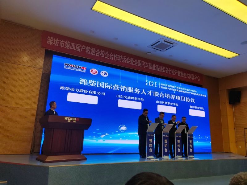 会上,汽车工程天行体育官方网站主要负责人与潍柴动力股份有限公司、山东交通职业天行体育官方网站、山东科技职业天行体育官方网站代表共同签署了国际营销服务人才联合培养项目协议。根据协议,将采用“学校理论学习+潍柴大学理实一体化学习+潍柴岗位实习”三段式培养模式,校企共同制定培养方案、共建课程体系,为企业定向培养具备国际视野的营销服务人才。潍柴将为考核合格毕业生提供就业岗位,实现人才培养与就业的有效对接。