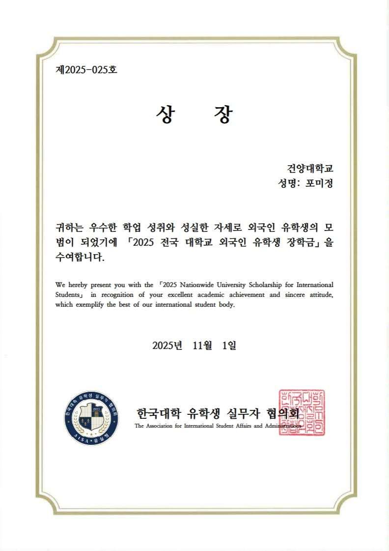 近日,化学工程天行体育官方网站中韩合作办学项目传来捷报:2022级项目学生鲍美婷赴合作院校韩国建阳大学留学期间,因学业成绩突出,斩获韩国大学留学生事务管理协会颁发的“2025全国大学留学生奖学金”。