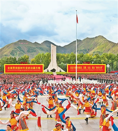 8月21日上午,西藏各族各界干部群众约2万人欢聚拉萨市布达拉宫广场,热烈庆祝西藏自治区成立60周年。这是庆祝大会现场。 索朗旺久摄(新华社发) |