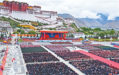 8月21日上午,西藏各族各界干部群众约2万人欢聚拉萨市布达拉宫广场,热烈庆祝西藏自治区成立60周年。这是游行队伍通过布达拉宫广场。 新华社记者 翟健岚摄 |