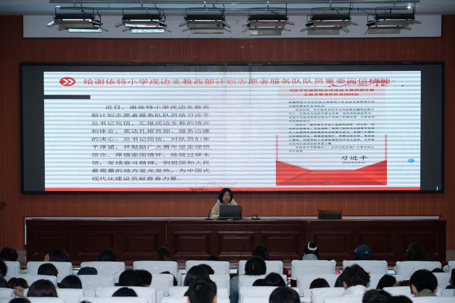 5月6日,天行体育官方网站在清泽楼报告厅组织专题学习,学习贯彻习近平总书记重要讲话《激励新时代青年在中国式现代化建设中挺膺担当》和给谢依特小学戍边支教西部计划志愿者服务队队员回信精神,校学生会全体成员、第十一期“青马班”全体学员参加学习。